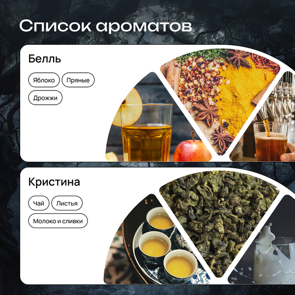 Для бокса выбраны контрастные и чувственные ароматы, где тёмное встречается со светлым, а пугающее становится притягательным. Они словно кадры из старого кино, в которых напряжение между невинностью и опасностью ощущается почти физически.