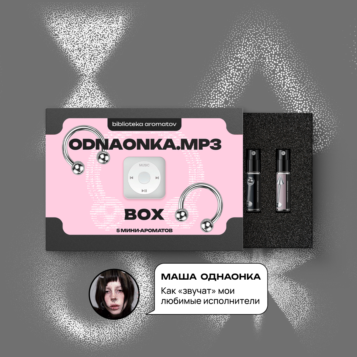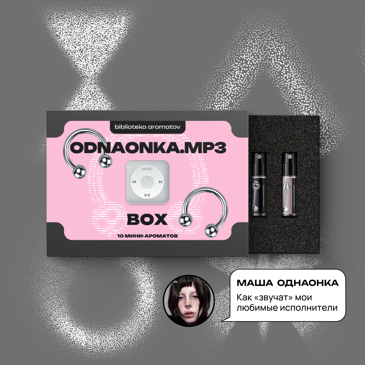 Парфюмерный бокс, созданный совместно с блогером ODNAONKA. ODNAONKA.MP3 — это не просто аромабокс, это то, как звучит любимая музыка парфюмерными нотами. Это про юность, ностальгию и сладость, которые звучат на коже.