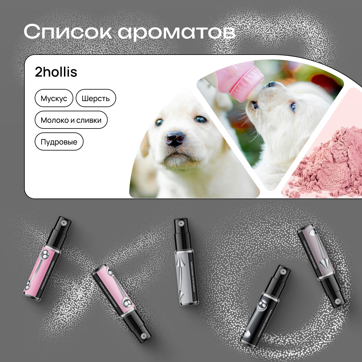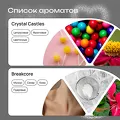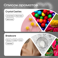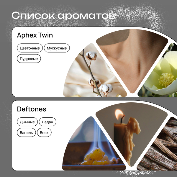 В боксе 5 ароматов от сладких до странных, каждый под вайб песни, исполнителя или жанра: Crystal Castles с нотами цветочной пудры, мускусный Breakcore, нежно-кремовый Aphex Twin, тёплый Deftones с нотами расплавленной свечи, 2hollis с молочными и мускусными нюансами.