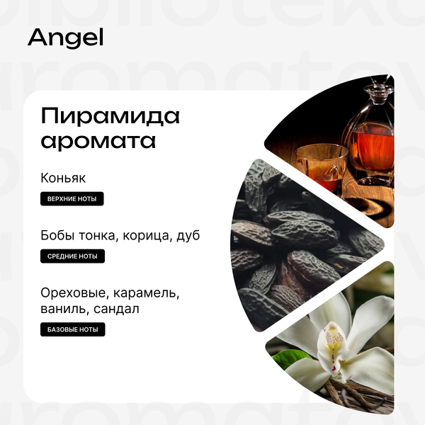 «Angel» — её тайна. Сияющий и чувственный, он словно луч в темноте, напоминающий о том, что в ней всегда есть нечто неземное. Композиция с пряными оттенками заиграет, опьяняя тёплым облаком бобов тонка, сандала и ванили.