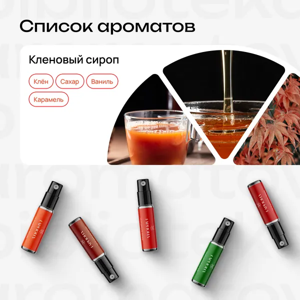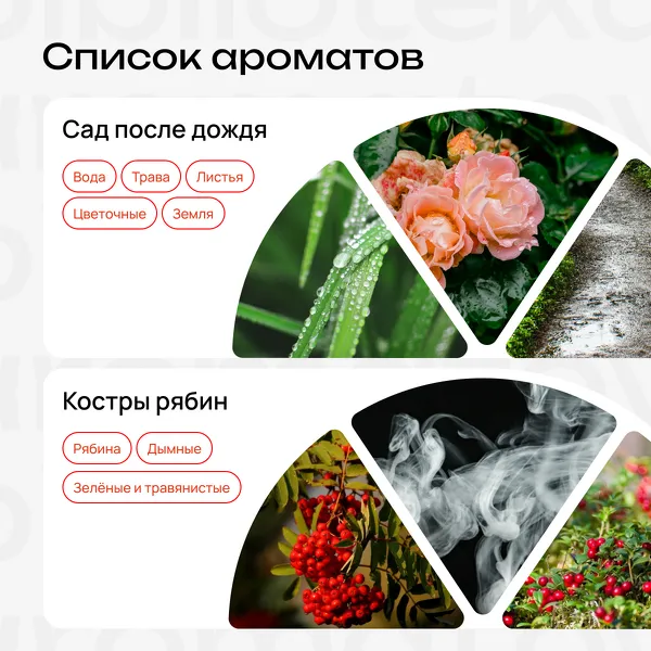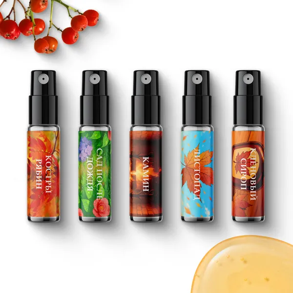 Горьковатый аромат спелых ягод, тронутых первым морозцем. Осенняя рябина отдаёт терпкой сладостью, как варенье из диких ягод, забытое на углях. Запах влажной земли, коры, сухого шиповника гармонично сочетается с игривым настроением ярких осенних бордовых ягод и багряной листвы. Лёгкая смолистость аромата напоминает о прохладе и тайне осенней природы. Для тех, кто ценит в осени не грусть, а лёгкость и яркие краски!