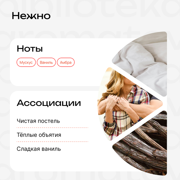 «Нежно» — это сонные объятия по утрам и уже родной запах, который останется потом на подушке. У него есть свой аромат, который прячется в чувственных парфюмерных молекулах амбры и ванили.