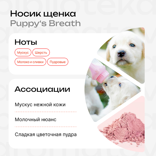 «Носик щенка» — чистый, уютный аромат радости. Лёгкий, с оттенком свежего воздуха после сна. Как запах доверия и тепла.