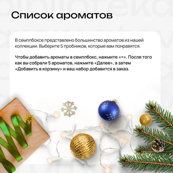 Соберите новогодний семплбокс — набор из 5 мини-флаконов по 1,5 мл. Это отличный вариант в подарок для себя, коллеге или другу в красивой праздничной этикетке, где каждый выбранный вами аромат превращается в заветное желание или поздравление.