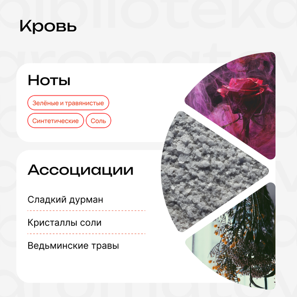 Вы точно не услышите жёсткие металлические ноты. Видимо, парфюмеры хотели сделать «носибельный» запах крови. Но я слышу медицинские бинты, вымоченные в сладких травах.