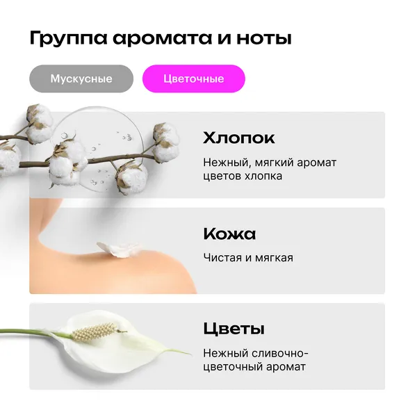 Веточка хлопчатника, мускус чистой кожи, пудровый нюанс цветка хлопка