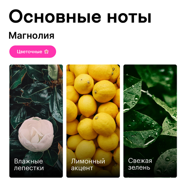 Фанаты лёгких цветочных ароматов, мы пришли к вам с букетом. Нежно-розовые бутоны магнолии, которые только распустились, зовут весну, а с ней ожидание лучшего. Магнолию не зря называют цветком-аристократкой. Ей не нужен броский макияж и плотный сладкий аромат, чтобы доказать свою красоту. Лёгких прозрачных нот с акцентами лимона и ванили достаточно, чтобы признать её превосходство.