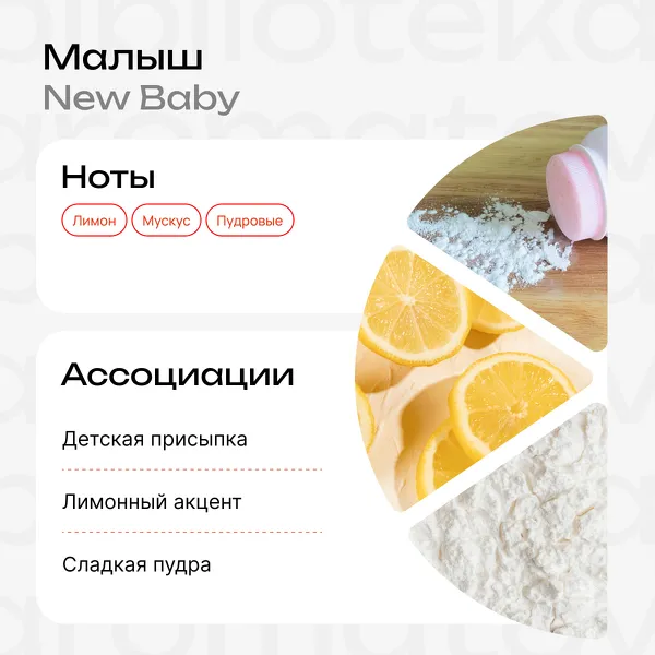 По словам Марка Креймса, создателя библиотеки Demeter, он шёл к появлению этого аромата почти 15 лет. И долгожданный малыш появился именно сейчас — наивный и чистый аромат «New baby». Несмотря на то что малышу уже 15, и он самый настоящий отрок, «New baby» — это весёлый, лёгкий, с едва уловимыми нотками «Детской присыпки» и лимона аромат, который всегда поможет, если вас заставляют идти на работу или заниматься делами по дому. Вы маленький, вам нужно отдыхать!