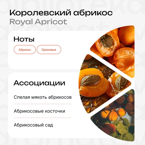 Чем отличается «Королевский» абрикос от своих братьев? Французским происхождением. Как известно, французы знают толк и во вкусах, и в ароматах. Сорт Королевского абрикоса отличается от других ярко-красным румянцем плодов и насыщенным фруктово-ореховым запахом, который отлично передан в аромате.