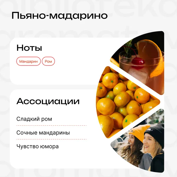 Свежий, яркий и немного шальной аромат, в котором энергия спелого мандарина сливается с нотами алкоголя. Сочный цитрус утопает в сладком роме, пьянеет и становится добрее. «Пьяно мандарино» — аромат для озорных и легких персон, которые могут добавить немного юмора в повседневность.
