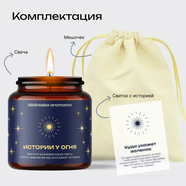 В каждой свече спрятан свиток с историей, вдохновлённой святочными гаданиями. Небольшой повод для улыбки, размышлений и уютного вечера при свете огня.
