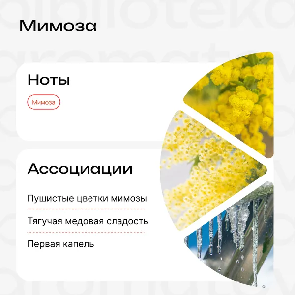 Аромат мимозы, весенних пушистых цветков, знаком с детства. Когда первые тёплые дни стучат в окна, то приносят живой аромат скромных жёлтых веточек. Во флаконе — он же. Чистый, медовый, бархатистый аромат, с оттенком еще прохладного воздуха и первых капелей. Носить «Мимозу» — значит, призывать весну, нести её, стать вестником пробуждения природы.
