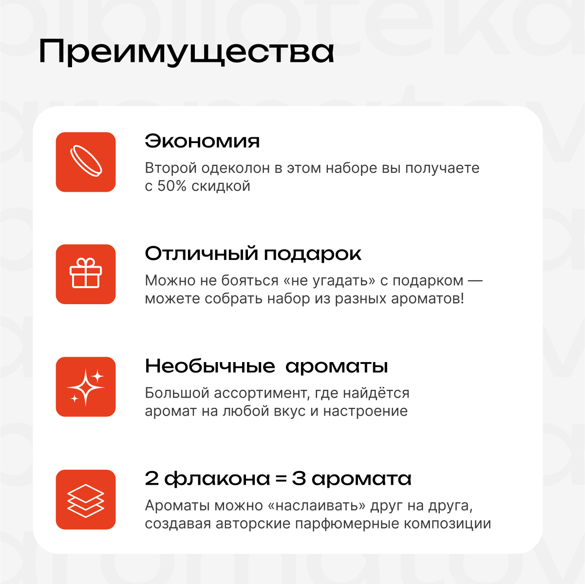 Набор с двумя одеколонами 30 мл от бренда Demeter, где второй со скидкой 50%. Выберите понравившиеся ароматы, наносите их по отдельности или миксуйте, создавая свою неповторимую композицию.