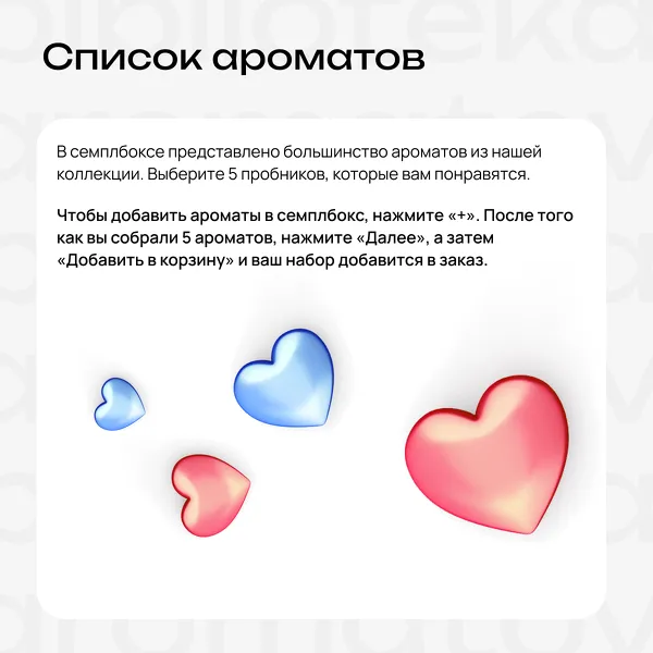 Обратите внимание: из-за ограниченного количества некоторых ароматов и для ускорения отправки вашего заказа мы можем заменить часть семплов в наборе на аналогичные ароматы.