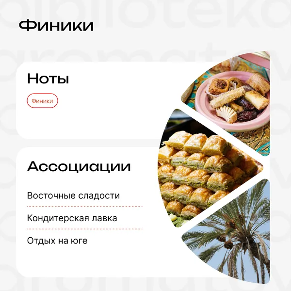 «Финики» — мало кто знает, что их аромат напоминает запах шоколадной конфетки с ликёром. Глубокий, обволакивающий аромат, который возвращает в тело и помогает замедлиться.