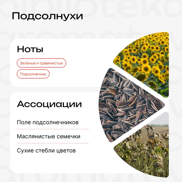 «Подсолнух» — аромат нескольких ярких солнц, собранных в вазу. С запахом лета, сухих зелёных стеблей и лёгким маслянистым шлейфом семечек. Помогает чувствовать вдохновение и устойчивость.