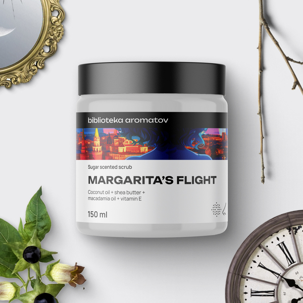 Захотелось пофантазировать о волшебном креме, благодаря которому Маргарита обрела силу ведьмы и неистово взмыла над Москвой. Какой у него аромат? Наверняка в креме были ноты безумно дорогих и редких французских духов, доступных только элите. Мускусную томность украшают ноты пыльной лаванды и нероли. А что придало магию мази в золотой коробочке, которую подарил Маргарите Азазелло? Густой сантал и горькие брызги лимона отвечают за мистику в аромате. Нанесите скраб «Полёт Маргариты», пробудите в себе ведьминскую силу и станьте королевой вашего бала жизни.