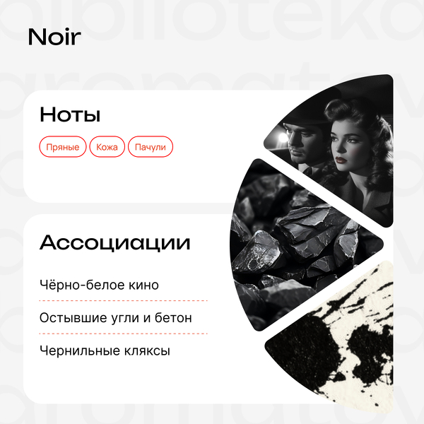 Чёрный вам к лицу. В аромате переплетаются эстетика викторианской готики, криминальных драм 40-х и Средневековья. Ноты чёрного угля, бетона и чернил — это нуар сквозь века.