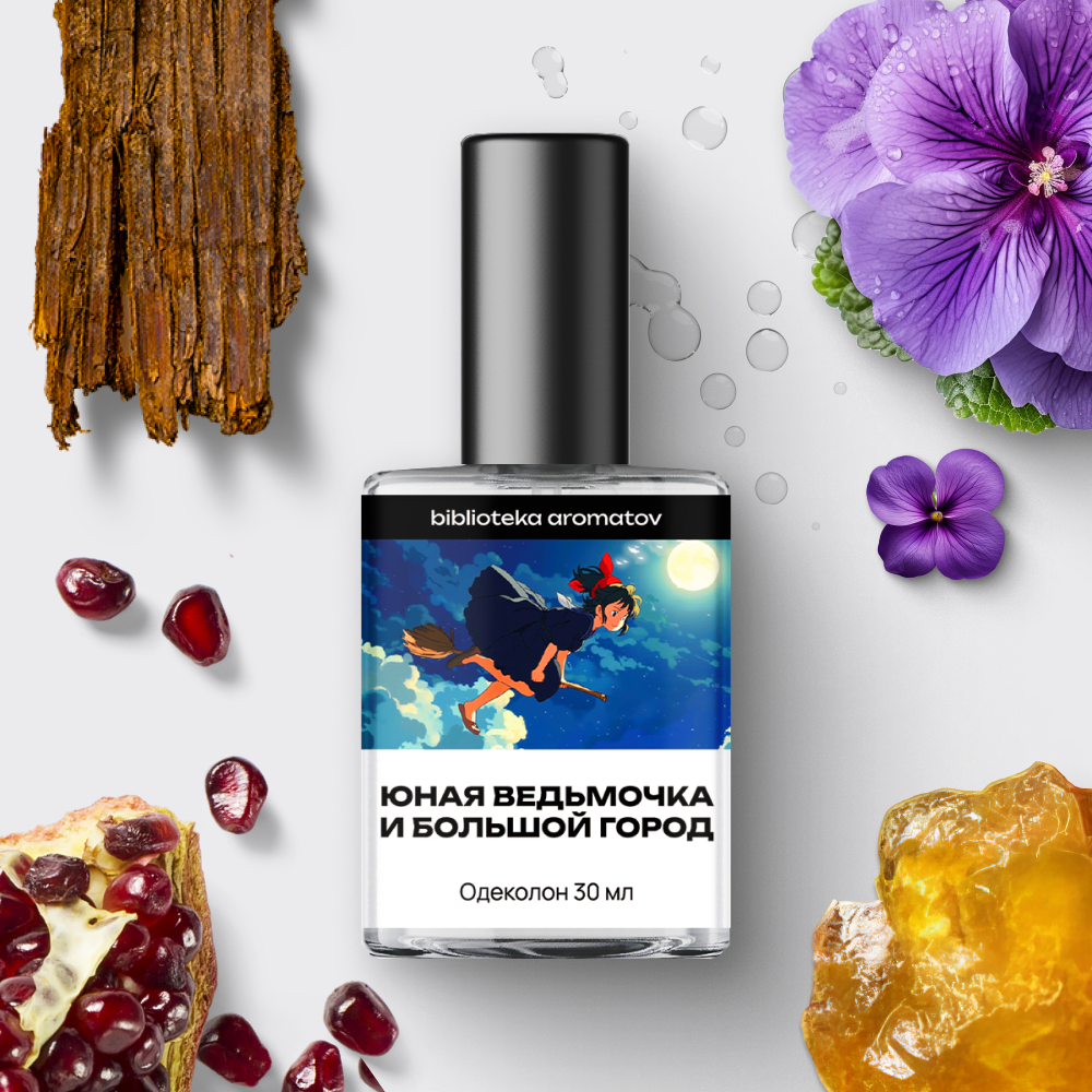 Когда вы тринадцатилетняя ведьма, хочется спрятать подальше традиционное чёрное платье и скучные обязанности. И с горячим сердцем бросить вызов большому городу и взрослой жизни, лелея в душе мечты. Пусть магия подчинится и наполнит вас решимостью. А затем заставит любимую метёлку смело рассекать облака, оставляя воздушный и сладкий шлейф от фруктового пирога, который нужно срочно доставить. Пусть этот амбровый аромат с нотами граната, цветов и дерева станет гимном доброго волшебства и цветущей юности, не знающей преград.